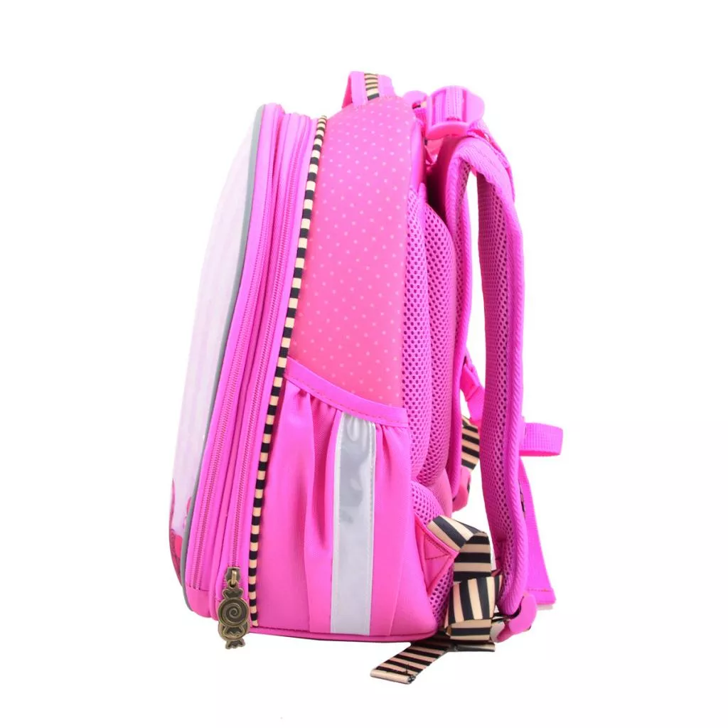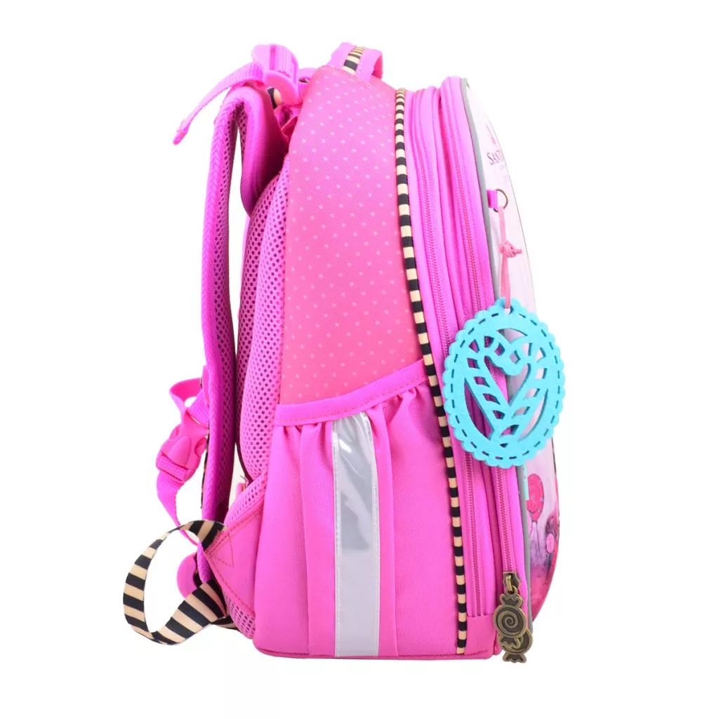Рюкзак предназначен для младших школьников, имеет два основных отдела. Внутри - сетчатый карман, разделитель для тетрадей, а также кармашек-кошелек. Вся поверхность рюкзака имеет жесткие вставки, передняя EVA-панель защищает его от повреждений, имеется 1 светоотражающий элемент, дно усилено плотной материей. Основной материал: полиэстер.