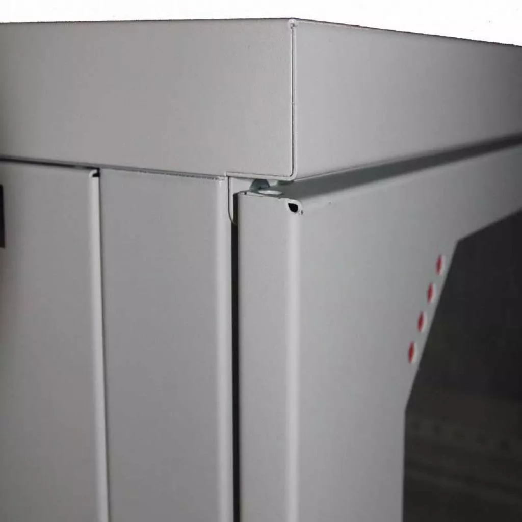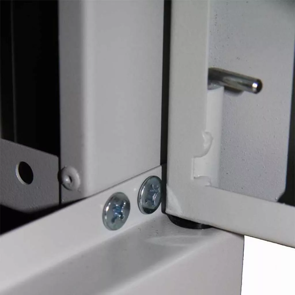 Сборка шкафов максимально и в полном объеме упрощена благодаря заранее запрессованным крепежным элементам. Для сборки достаточно отвертки. 19" Монтажные рейки устанавливаются с шагом 20мм. в круглые отверстия.