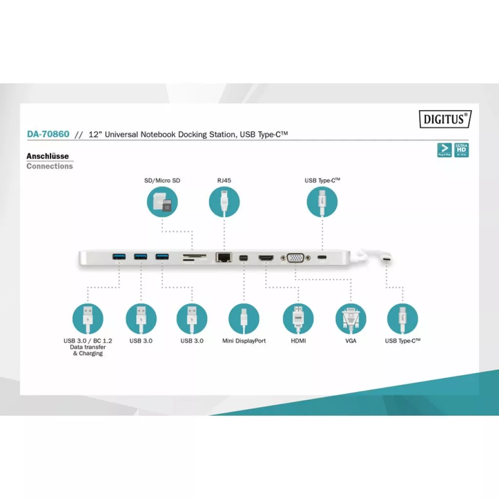 Полностью перечень функций и возможностейьная и точно подходит док-станция для ноутбуков от DIGITUS предлагает все необходимое для создания полностью оборудованной рабочей станции. Он предлагает три видеоинтерфейсы (HDMI, MiniDP, VGA), где можно одновременно управлять двумя мониторами. Таким образом, достигается лучшая поддерживаемое разрешение: Блестящий UHD (4K2K / 30 Гц). Кроме того, есть три порта USB 3.0, где один порт (5V / 1.5A) также обеспечивает функцию зарядки для мобильных устройств. Интерфейсы USB дополняются USB-C с перечень функций и возможностейом подачи питания (PD). Также встроены два считыватели карт (MicroSD, SDHC, SDXC / MMC). Ваш ноутбук можно подключить к сети с помощью кабеля через порт Gigabit Ethernet. Мы заканчиваем все стерео-аудио портом. Разверните свой 12-дюймовый ноутбук на 11 дополнительных портов через один порт USB-C - с помощью многоперечень функций и возможностейьной док-станции для ноутбуков Digitus.