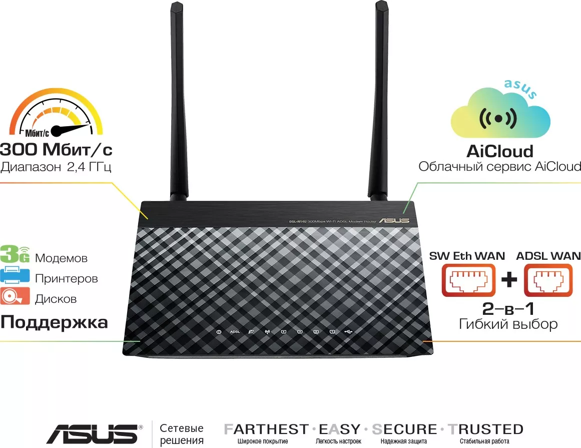 В беспроводном маршрутизаторе со встроенным ADSL-модемом Asus DSL-N14U стильный дизайн сочетается с широкой функциональностью. Устройство сможет удовлетворить самых требовательных пользователей. DSL-N14U предлагает пользователям простой и интуитивно-понятный интерфейс. Благодаря мощным антеннам DSL-N14U обеспечивает широкую зону покрытия беспроводной сети. С помощью роутера имеется возможность создания нескольких беспроводных сетей (SSID). Подключив к порту USB принтер или сканер, клиенты беспроводной сети смогут пользоваться возможностями сетевой печати или сканирования.