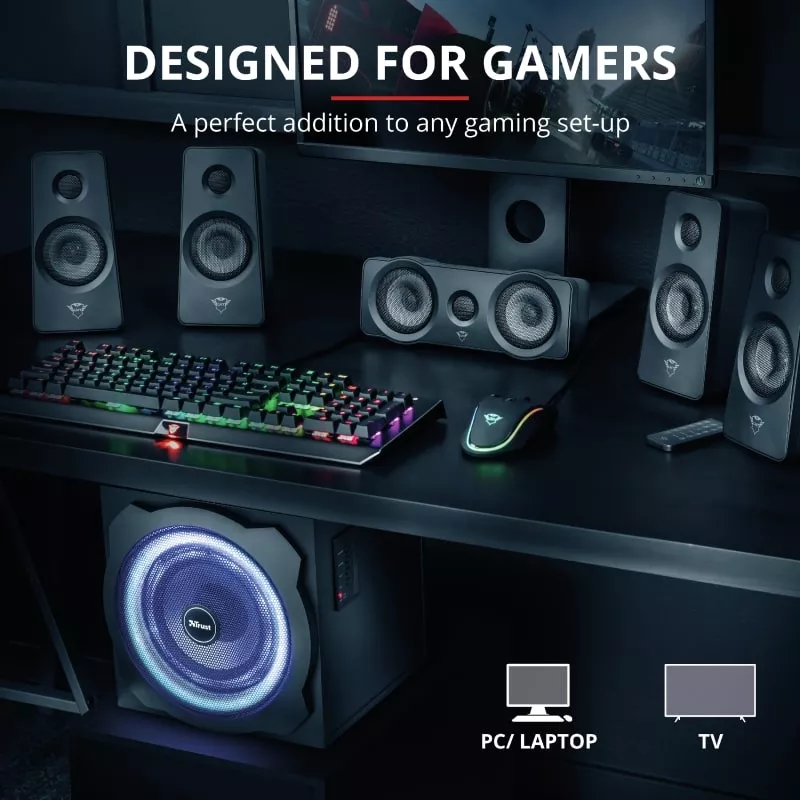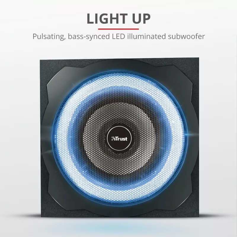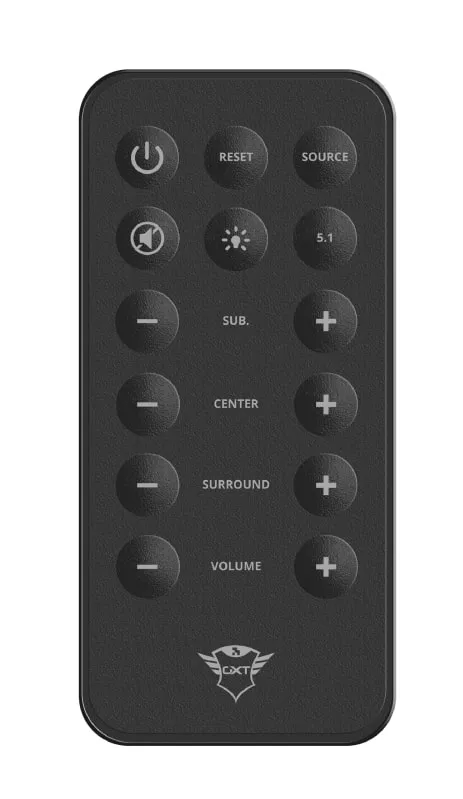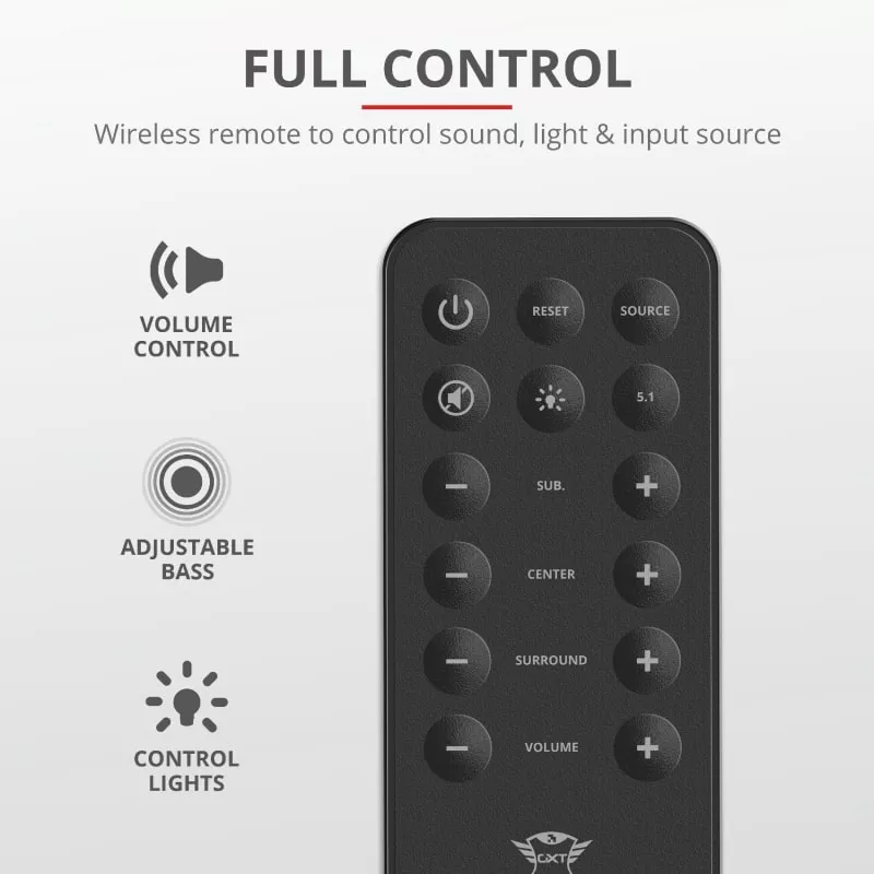 Беспроводное дистанционное управление позволяет вам изменять громкость, источник (соединение). AUX или 5.1), свет, объемный звук динамика, громкость сабвуфера и громкость центрального динамика. Для этого не нужно вставать со стула! На боковой панели сабвуфера вы также можете включить/выключить акустическую систему, отрегулировать громкость и изменить источник.