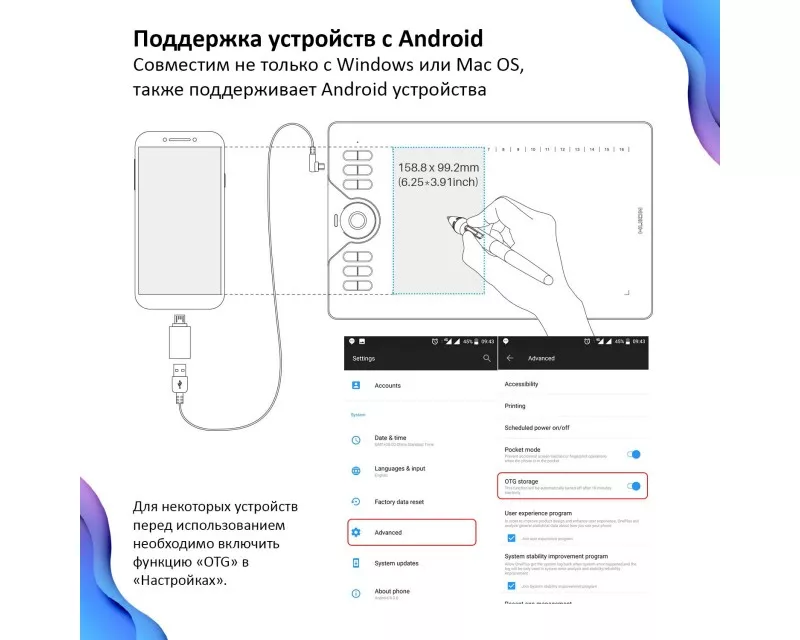 Интуитивно понятный в управлении планшет HS610 поддерживает соединение с мобильным телефоном через адаптер с технологией OTG, позволяющий рисовать в любой время и в любом месте. Теперь вы можете выйти на пленэр с планшетом. Шишкину и Левитану такое даже присниться не могло!