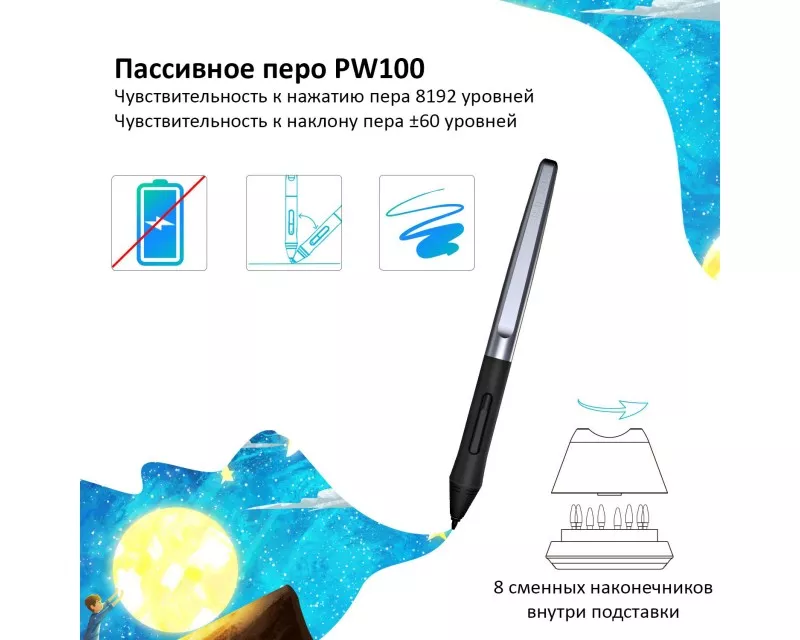 Цифровое перо PW100, разработанное с использованием технологии EMR (электромагнитного резонанса), работает без батареи и не требует зарядки, что обеспечивает большую свободу в рабочем процессе и позволяет больше сосредоточиться на творчестве.