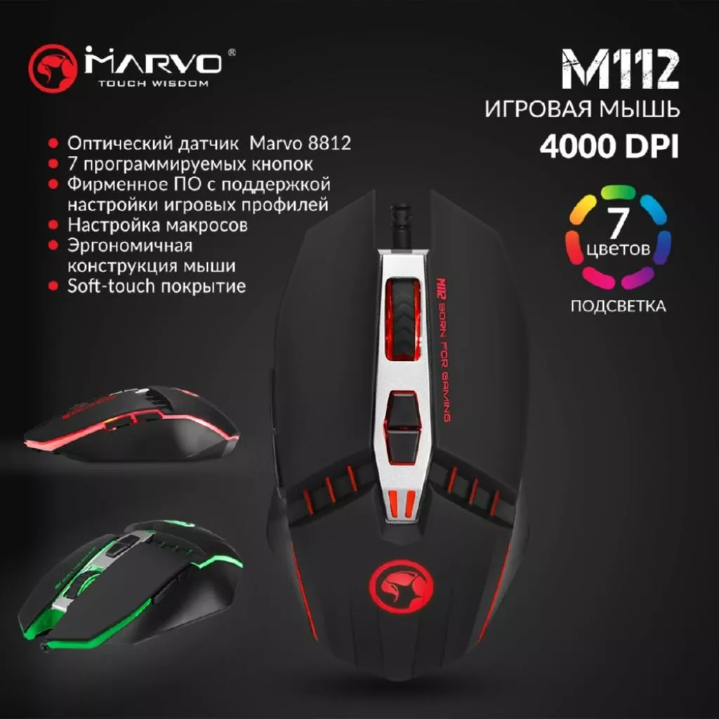 Игровая мышь MARVO M112 безупречный инструмент для победы. Удобно ложится в руку, даже при длительных баталиях вы не почувствуете дискомфорта. Современный оптический сенсор Marvo 8812 с разрешением 4000 DPI моментально реагирует на ваши действия, разработан с учитыванием требований игроков. 7 кнопок, программируются через фирменное программное обеспечение с возможностью записи макросов. Кнопки расположены так, чтобы вы могли легко добраться до Ппрактически любой из них. Дополнительное преимущество мыши, 7 цветная подсветка, с эффектом дыхания.