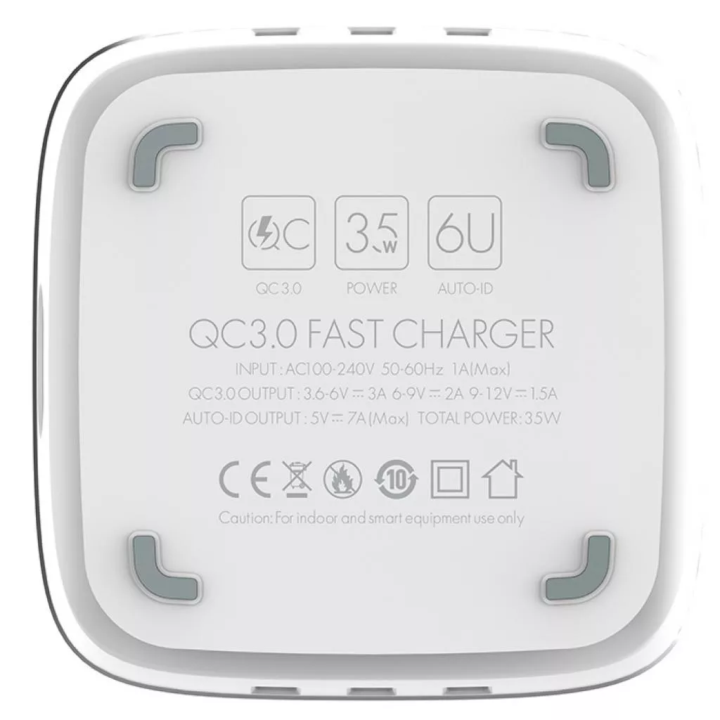 USB зарядное устройство премиум класса, c поддержкой технологии быстрой зарядки Quick Charge 3 и со встроенной интеллектуальной микросхемой USB Auto ID, которая автоматически определяет тип подключенного устройства и обеспечивает максимально возможный ток заряда. Умная зарядка быстро и безопасно может заряжать до 6-ти мобильных устройств одновременно: смартфоны, планшеты, внешние батареи и многие другие устройства.