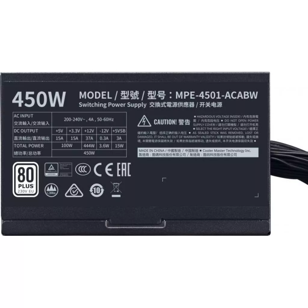 Cooler Master 450W MPE-4501-ACABW - надежный и стабильный компьютерный блок питания. Изготовлен он из качественных материалов и компонентов, чтобы быть уверенным в хорошей работоспособности блока, на протяжении длительного времени. Охлаждается при помощи активного вентилятора. Блок оснащен и укомплектован различными разъемами, что даст возможность питать разнообразные компоненты системы.
