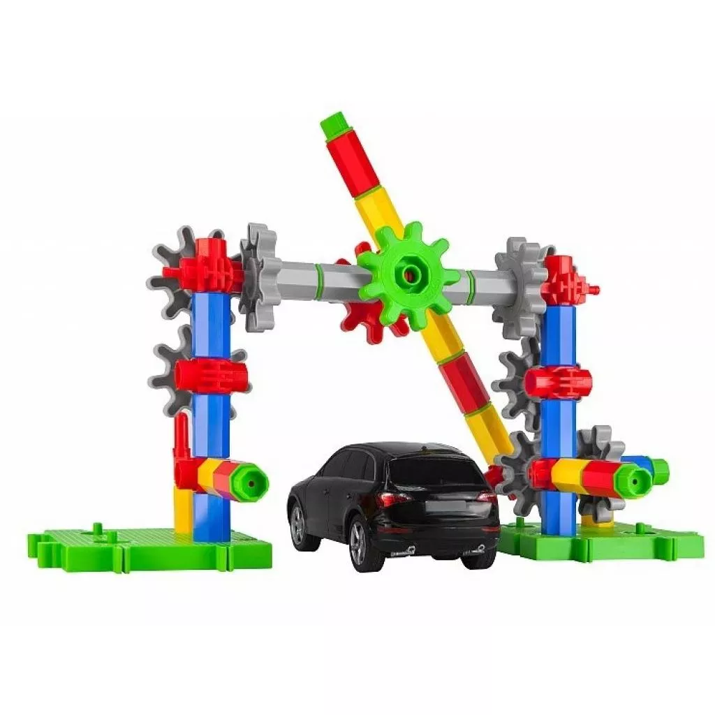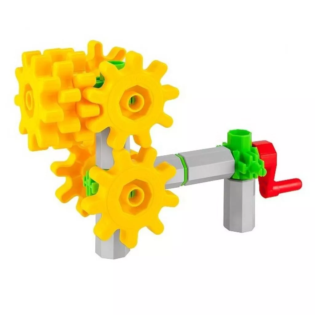 В наборе есть детали для создания 8 платформ и 72 шестеренки. Это дает возможность создавать сложные объекты, которые в работе раскрывают основные принципы механики. В комплект входит руководство, показывающее 13 заданий с разной степенью сложности. Все детали собраны в удобной для переноски и хранения коробке.