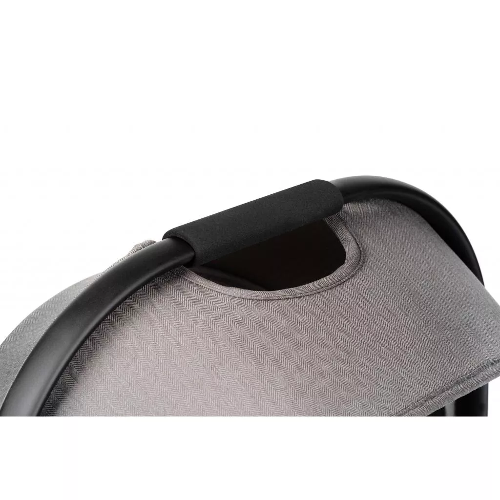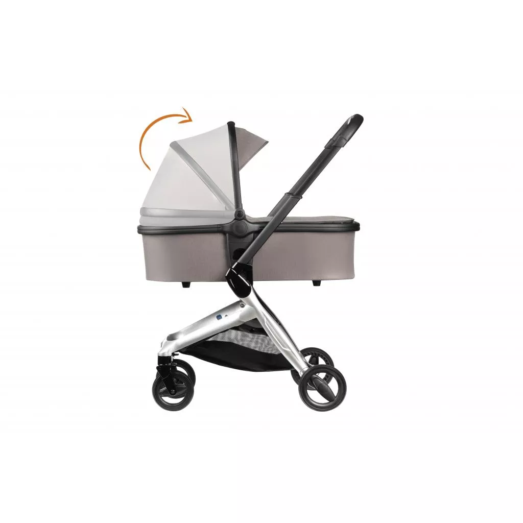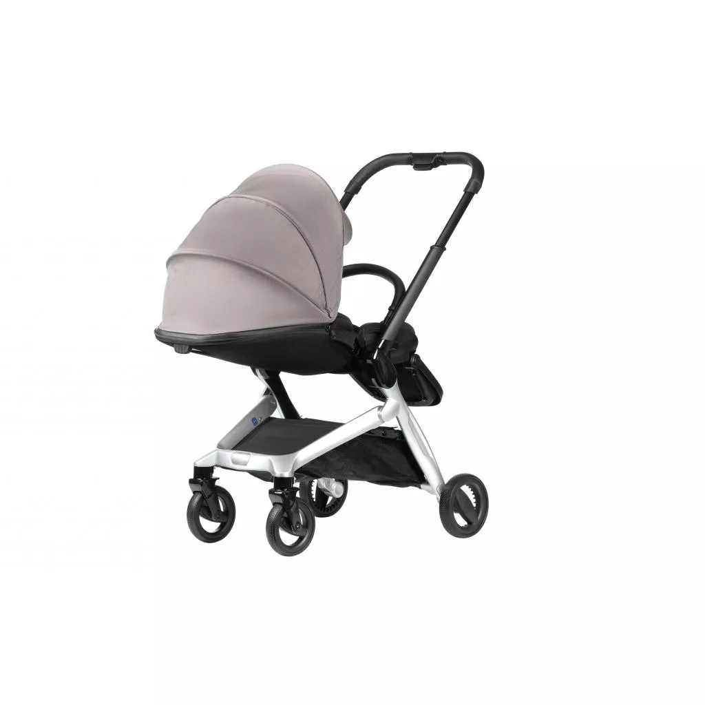 Люлька выполнена по традиционной конструкции с металлическими основаниями и текстильными вставками в сдержанном дизайне. Капюшон оснащен и укомплектован ручкой для переноски, а также отворачивающимся сегментом для вентиляции. Чехол на ножки закрепляется на молнии. Ортопедический матрас выполнен из плотного материала и специально разрабатывался с учитыванием всех требований по перевозке младенцев. Внутренняя часть люльки обрамлена тканью с мягким наполнителем