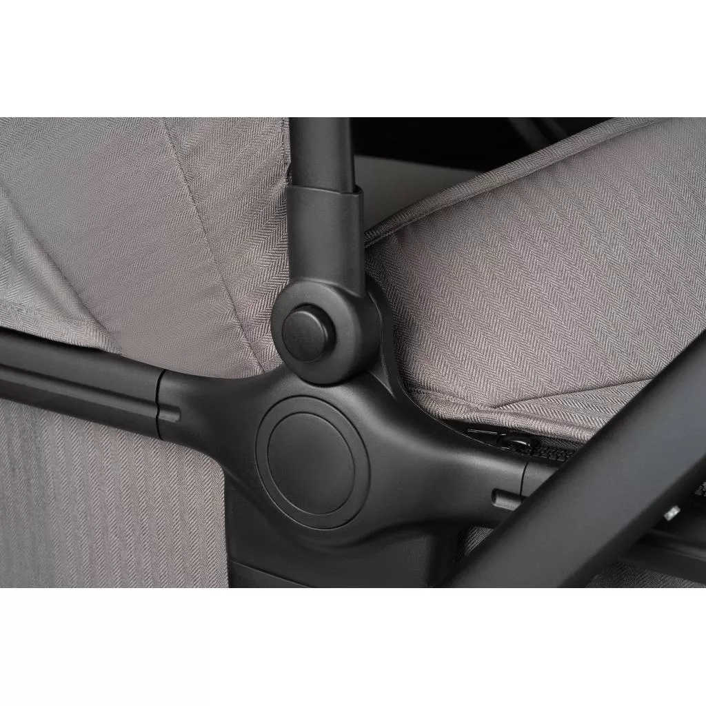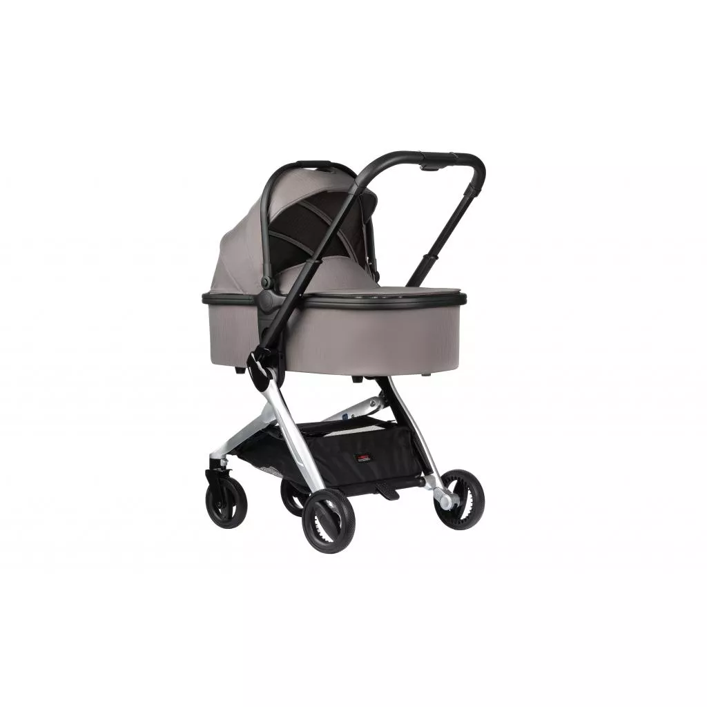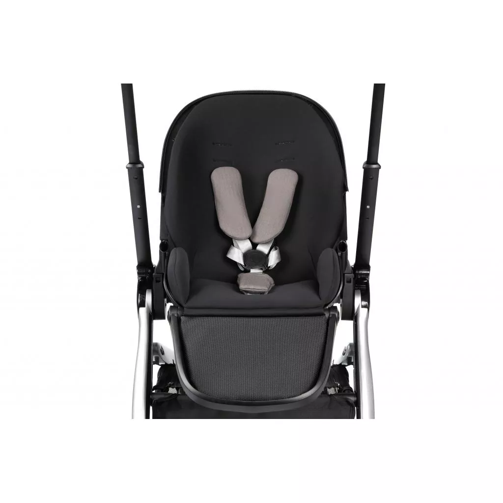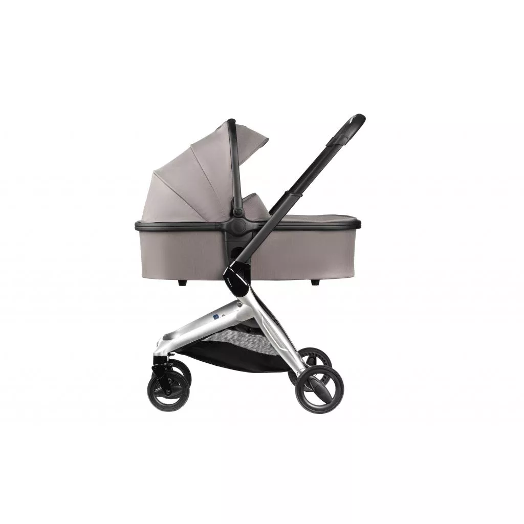 Люлька выполнена по традиционной конструкции с металлическими основаниями и текстильными вставками в сдержанном дизайне. Капюшон оснащен и укомплектован ручкой для переноски, а также отворачивающимся сегментом для вентиляции. Чехол на ножки закрепляется на молнии. Ортопедический матрас выполнен из плотного материала и специально разрабатывался с учитыванием всех требований по перевозке младенцев. Внутренняя часть люльки обрамлена тканью с мягким наполнителем
