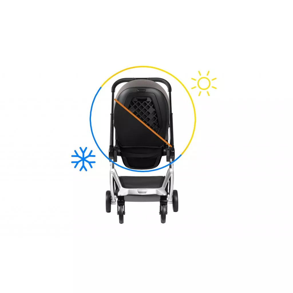 Летом, даже в самые жаркие дни, ребенку не будет жарко сидеть в нем. Воздух беспрепятственно сможет циркулировать. При этом в зимнее время, вся конструкция спинки закрывается многослойным, утепленным чехлом и помогает сохранять тепло. Благодаря многослойности она быстрее нагревается и защищает от ветра и мороза гораздо лучше чем цельно пластиковая конструкция.