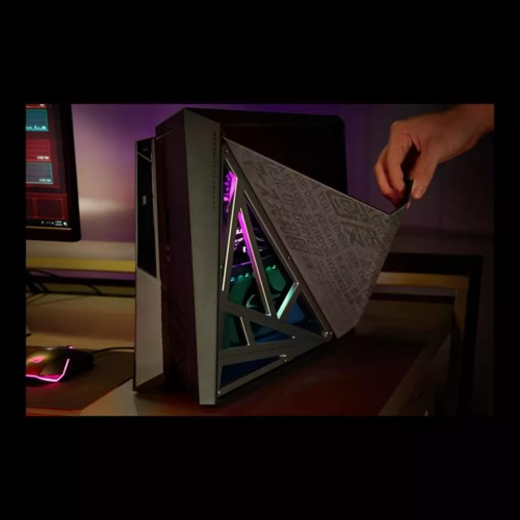 ROG Huracan (G21) – это высокопроизводительный игровой компьютер, выполненный в компактном корпусе объемом 13 литров. В его дизайне прослеживаются элементы стилей «кибервойна» и «киберпанк»: агрессивные, резкие линии выглядят словно полученные в бою шрамы. На левом «борту» устройства имеется панель с магнитным креплением, которую можно приоткрывать, чтобы улучшить охлаждение и производительность системы.
