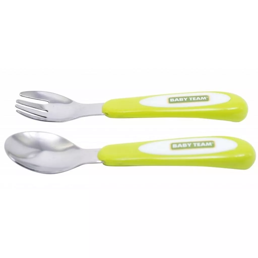 Набор для кормления Baby Team включает ложечку особенной круглой формы и вилочку с закругленными для дополнительной безопасности, зубчиками.