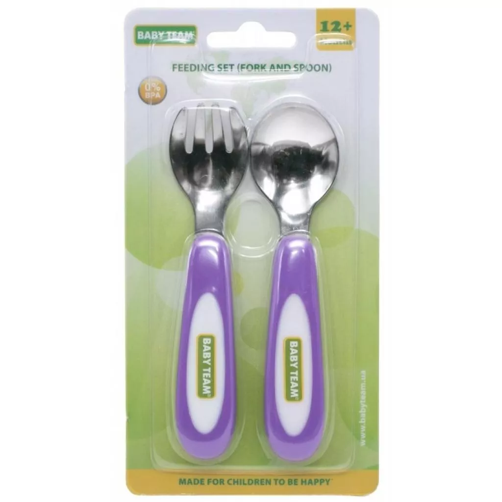 Набор для кормления Baby Team включает ложечку особенной круглой формы и вилочку с закругленными для дополнительной безопасности, зубчиками.