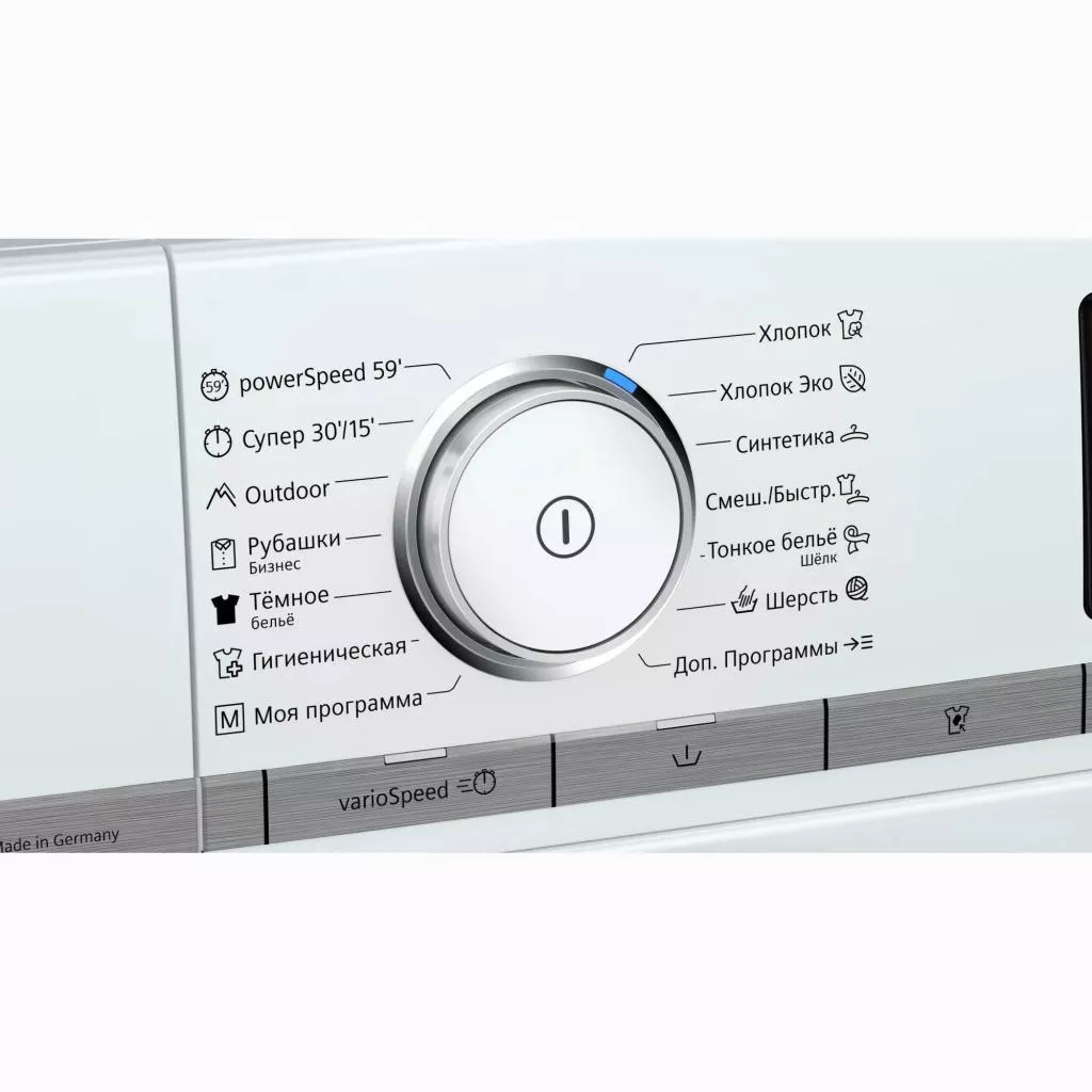 Siemens WM16XFH1OE имеет 16 программ стирки, среди которых есть много режимов с гигиеническим и антиаллергенным действием, хлопок, чувствительная стирка, стирка рубашек, блуз, деликатного белья, постельного белья, спортивной одежды. Все режимы выбираются на большом светодиодном тачпаде TouchControl. Также, такой дисплей контролирует отсроченный старт, выбор температуры, дозагрузку белья и так далее. максимально возможная загрузка белья для данного барабана объемом 70 литров составляет 10 кг.