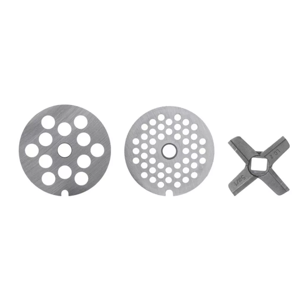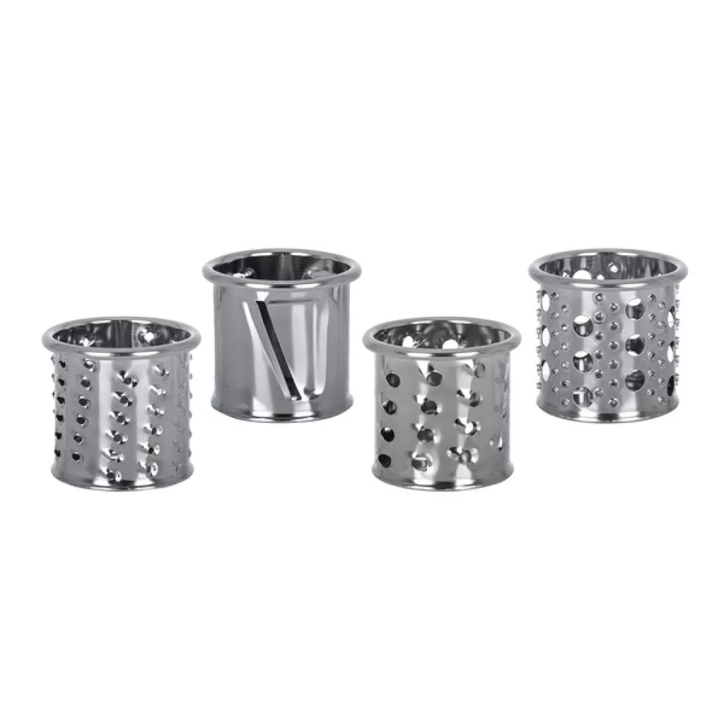 В вашем распоряжении множество насадок, которые помогут обработать ингредиенты разной структуры, а также придать им определенную форму. К примеру, в наборе есть несколько дисков с перфорациями разного диаметра, шинковочные и терочные инструменты, а также насадка для создания колбасок.