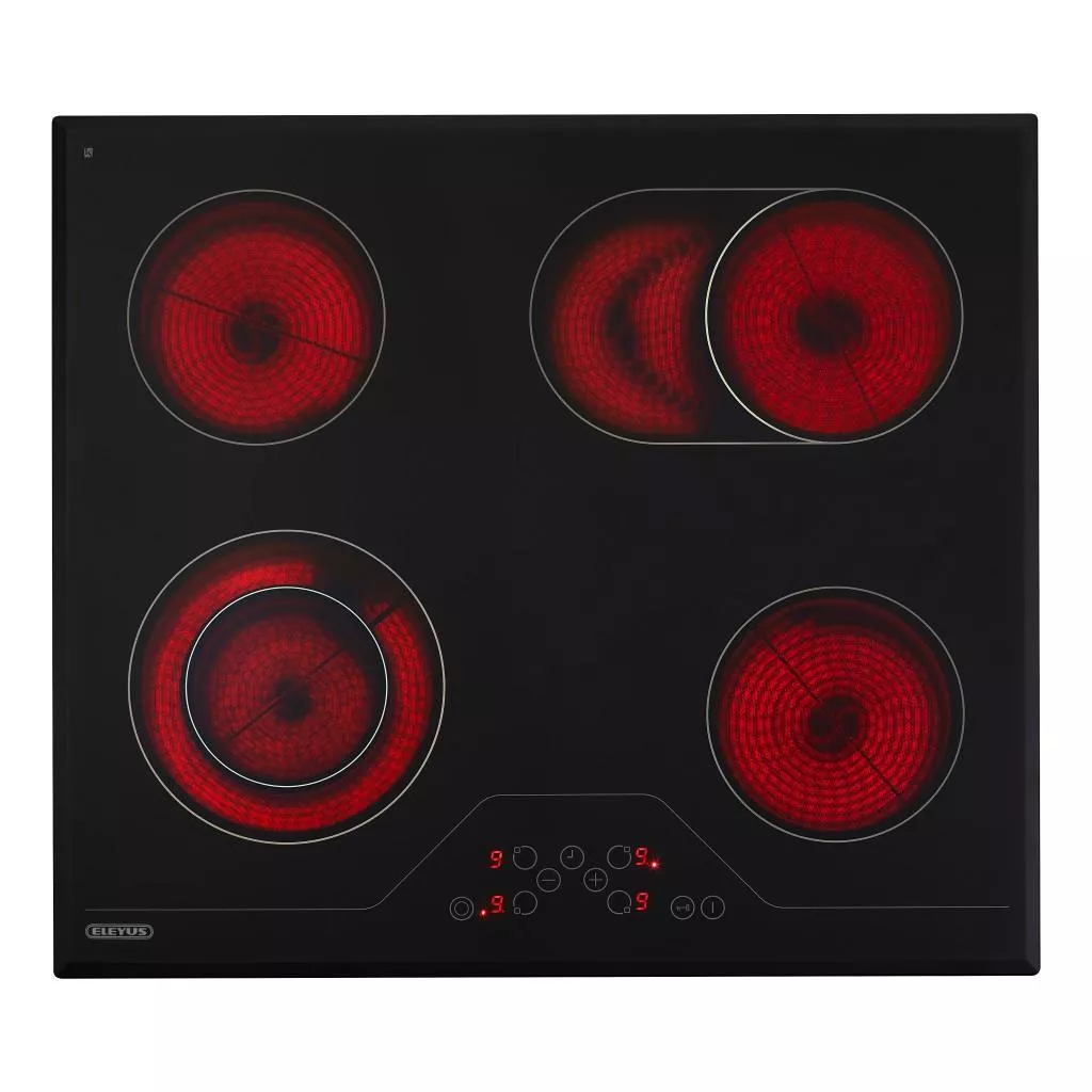Eleyus OLIVIA 60 BL V имеет 4 зоны нагрева – 2х145 мм в диаметре и 1200 Вт мощности, 1х180 с двойным нагревательным элементом и мощностью соответственно 700 Вт и 1700 Вт, а также 1х180 мм с двойным овальным нагревательным элементом, мощностью 1000 Вт и 1800 Вт. Двухконтурная зона имеет дополнительное кольцо нагрева, его включения поможет быстрее приготовить блюдо. Овальная дополнительная зона нагрева эффективно даст возможность приготовить вам блюда в утятнице или в посуде с овальным дном.