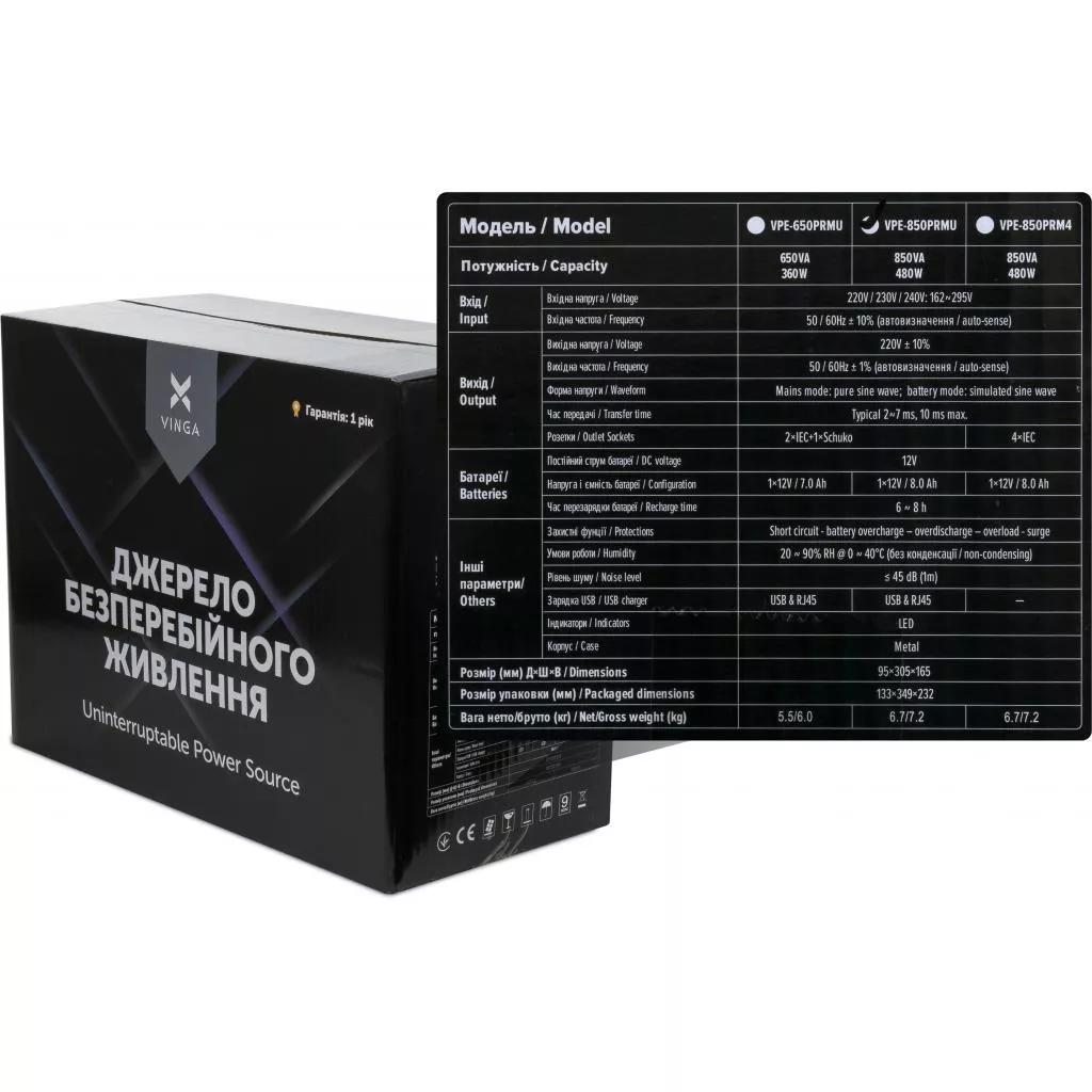 Корпус у Vinga LED VPE-850PRMU Прочный металлический, так что ему не страшны случайные пинки ногами, если он установлен под столом. LED-дисплей состояния покажет Уровень (степень) заряда, и проинформирует сколько у вас осталось времени на все манипуляции при отключении. У устройства есть собственный микропроцессор, который управляет преобразованием частот, работой аккумуляторов и системой оповещений.