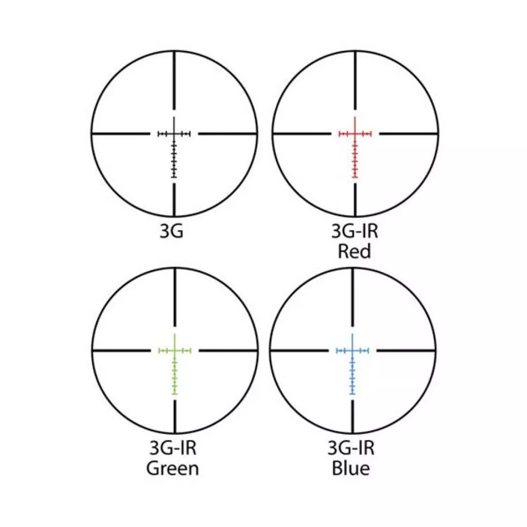 Прицел оснащен и укомплектован специальной дальномерной сеткой IR 3G, которая имеет по три режима яркости для каждого из трех цветов подсветки (красного, зеленого и синего). Благодаря шкале сетки можно принять поправку на ветер и учесть траекторию падения пули при стрельбе на более дальние дистанции нежели 400 м. Данная прицельная марка размещена во второй фокальной плоскости. Сама сетка выполнена методом гравировки на стекле, благодаря чему без проблем противостоит разрушению при отдаче.