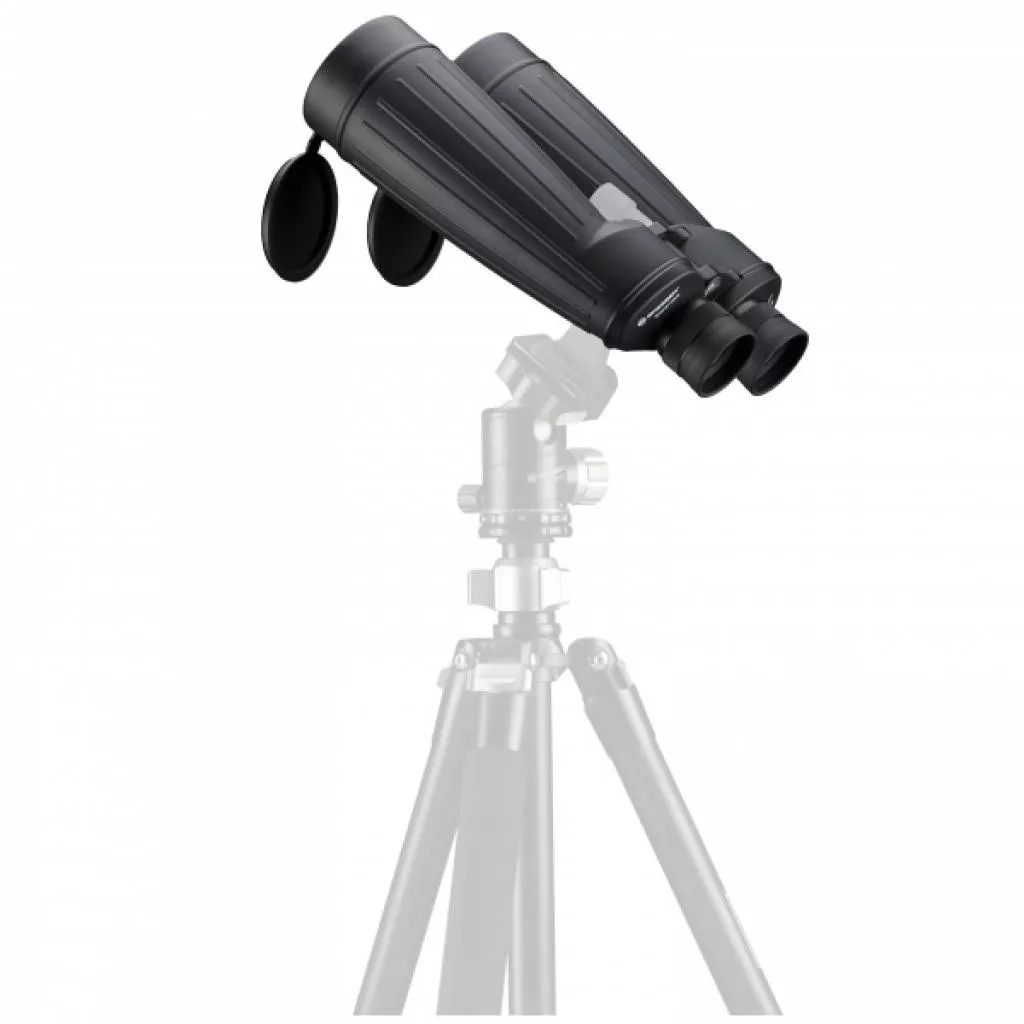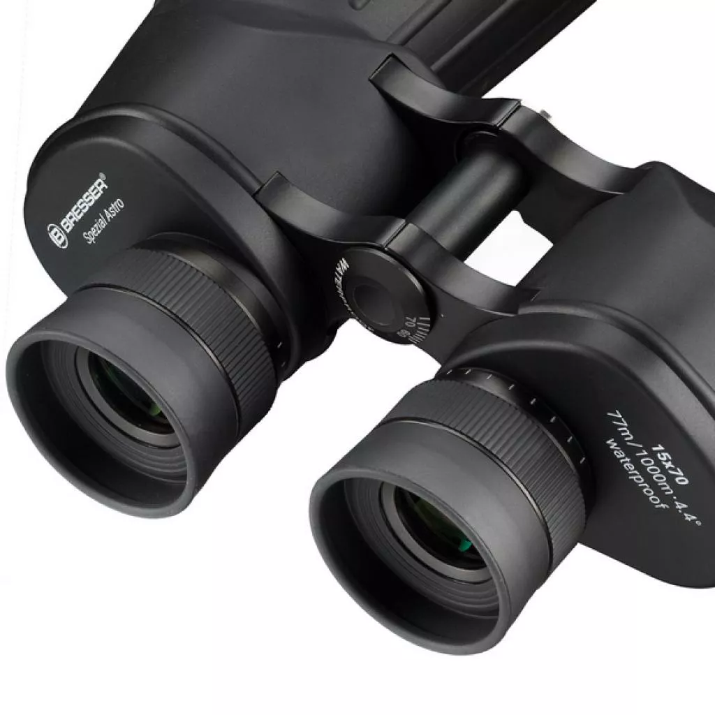 Линейка астрономических биноклей Bresser пополнилась высококлассной моделью с улучшенными оптическими и эксплуатационными характеристиками Spezial-Astro SF 15x70 WP, которая стоит в одном ряду с лучшими моделями для астрономии в своем классе. Как и положено специализированным астробиноклям, данная модель имеет раздельную фокусировку на каждом из окуляров, что обеспечивает максимальную резкость изображения на любом астрономическом расстоянии, во всем диапазоне диоптрийной коррекции. Также стоит отметить, что для предотвращения запотевания бинокль заполнен не традиционным азотом, а аргоном, который в полной мере относится к инертным газам, не реагирует при нормальных условиях с другими химическими элементами, сохраняя длительное время свои изначальные свойства. Окуляры состоят из пяти линз, сгруппированных в трех группах, и обеспечивают высокую степень коррекции изображения и достаточно большой угол зрения. Полное многослойное просветление всех оптических поверхностей, и призмы BAK4 передают равномерно светлое по всему полю зрения изображение. 70-мм объектив собирает достаточное количество света для наблюдений двойных звезд, звездных скоплений и планетарных наблюдений. Несмотря на основное назначение, данный прибор может быть с успехом использован для стационарных ландшафтных наблюдений, наблюдений городских достопримечательностей, наблюдений за миграцией птиц или движением судов на море на расстоянии от одного километра и более.