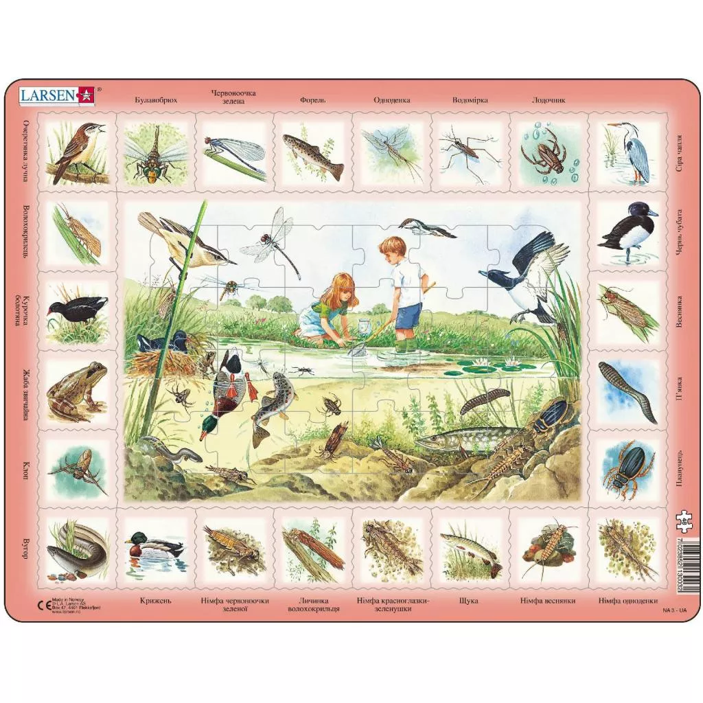 Все мы любим отдыхать на берегу озера. Но многие даже не подозревают сколько в нем обитателей. Стрекозы и жуки, утки и цапли, тритоны и лягушки, окуни и пискари — всем найдётся здесь место. Сложи пазл и увидишь живой мир озера.